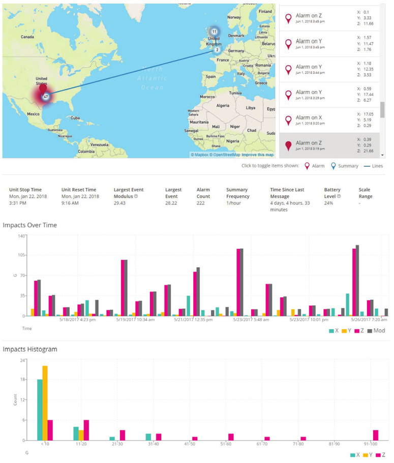 SpotSee云是實時行程數據匯集的平臺。這些圖表易于閱讀,包括位置、隨時間變化的影響、柱狀圖和溫度等數據。